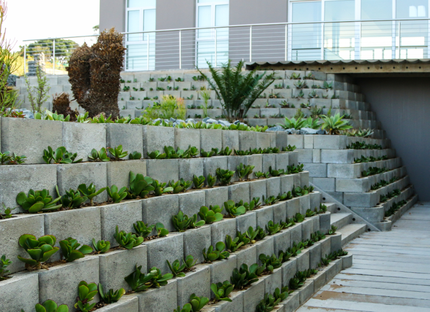 Plantable earth retaining wall systems for vertical to 30-degree angle applications including stairways and planter boxes.